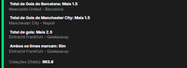 Com uma aposta de R$5, o apostador montou a odd mais alta da semana, com 963,76 apostando no resultado final, mercado de gols e ambos marcam, seja de jogos do Brasileirão e também da Champions League. Veja o boletim de apostas: