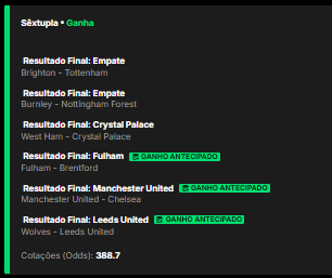 Mais uma aposta de valor baixo, com R$5 e, nessa daqui, a cravada foi na Premiere League. Seis jogos e seis resultados finais cravados com sucesso. Se liga na mitada: